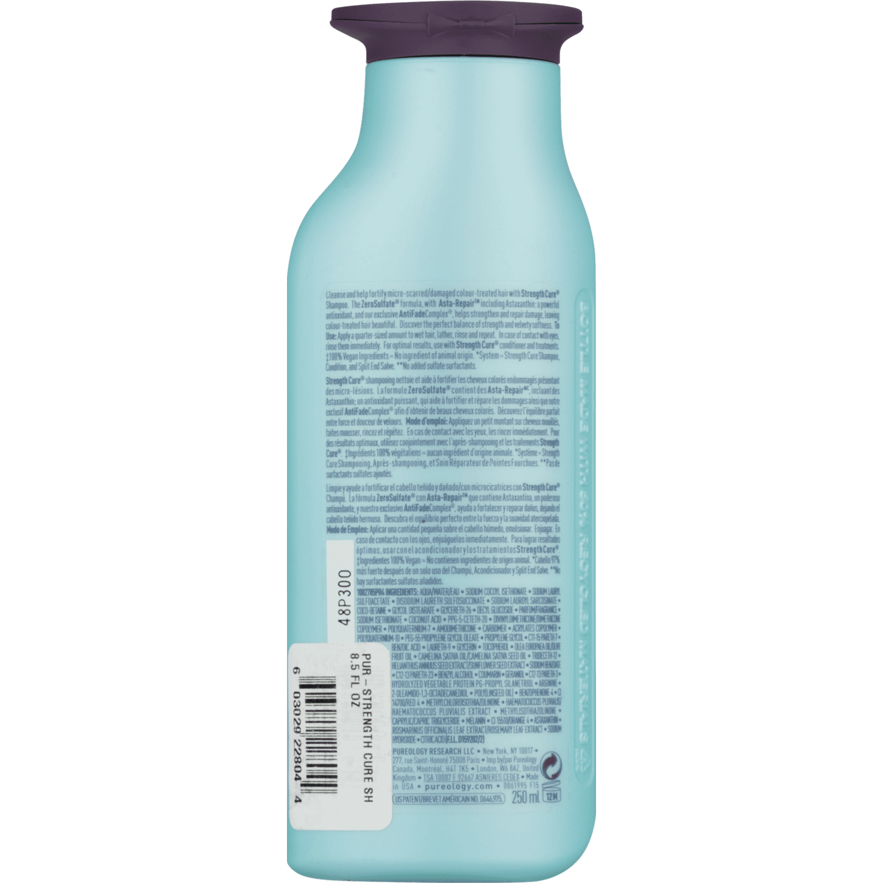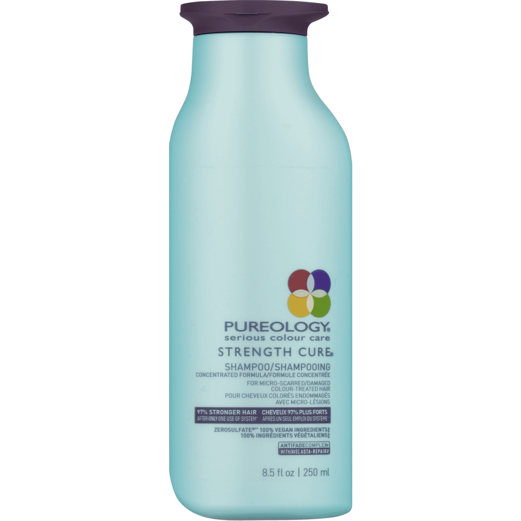 Pureology® Serious Colour Care Strength Cure® Shampoo. Concentrated formula. 97% Stronger hair after only one use of system. Cleanse and help fortify micro-scarred and damaged colour-treated hair. The Zerosulfate® formula, with Asta-Repair? including astaxanthin, a powerful antioxidant, and our exclusive antifadecomplex, helps strengthens and repair damage, leaving colour-treated hair beautiful. Discover the perfect balance of strength and velvety softness. Made with 100% vegan ingredients.